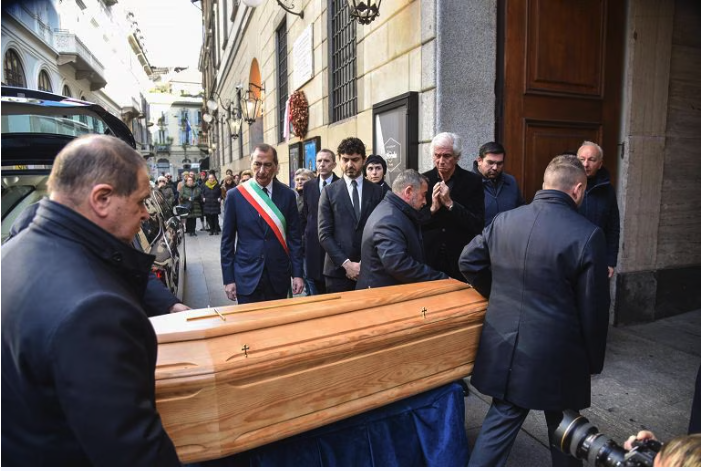 E’ la voce di Ornella Vanoni che canta “Domani e’ un altro giorno si vedra‘” ad accogliere i visitatori alla camera ardente dell’artista allestita al Piccolo teatro di Milano in via Rovello. Accanto al feretro i gonfaloni del Comune di Milano, dalla citta’ metropolitana e della Regione Lombardia e, alle sue spalle, una corona di rose bianche del Piccolo Teatro d’Europa. Un flusso continuo di visitatori, che fuori dal teatro raggiunge quasi piazza Cairoli, si ferma un istante a depositare un fiore e a dire una preghiera.