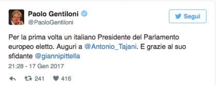 Auguri bipartisan dal Parlamento italiano ed un messaggio di complimenti del presidente del Consiglio, Paolo Gentiloni: “Per la prima volta un italiano eletto presidente del parlamento europeo. Auguri a Antonio Tajani e grazie al suo sfidante Gianni Pittella“.
