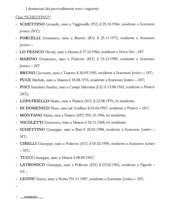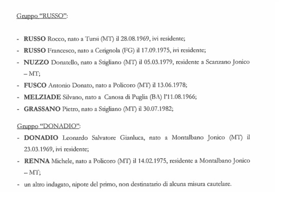 Gli arrestati sono stati accusati di essere componenti, a vario titolo, di un’associazione armata di stampo mafioso con base a Scanzano Jonico denominata “clan Schettino” che si occupava principalmente di estorsioni in danno di imprenditori del Metapontino ed allo spaccio di stupefacenti, e di un altro gruppo criminale denominato “gruppo Russo” attivo nel traffico di cocaina e hashish. La Procura distrettuale antimafia di Potenza ha smantellato anche terza associazione criminale, denominata “gruppo Donadio” che operava a Montalbano Jonico nel traffico e spaccio di sostanze stupefacenti, dei quali veniva approvvigionata dal clan Schettino e dal gruppo Russo. Fra gli arrestati anche un carabiniere in servizio Maurizio Poci , che è stato arrestato dai suoi stessi colleghi.