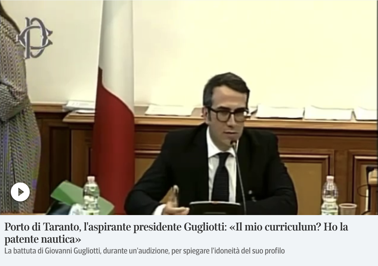 Eclatante e vergognoso il caso della nomina a Taranto di un ex sindaco di provincia, Giovanni Gugliotti, con precedenti penali, la cui audizione parlamentare è diventata “virale” per la pochezza personale e professionale del candidato della Lega, sostenuto dal senatore leghista Roberto Marti, che da anni cerca di guadagnare posizioni nella politica ed econima jonica, con scarsi risultati Sulle nomine in particolare quella di Gugliotti a Taranto permane il precedente non irrilevante di una sentenza definitiva della IV sezione del Consiglio di Stato presieduta dal giudice Giorgio Giaccardi, che anni fa revocò la nomina di un presidente ( Piergiorgio Massidda, ex senatore Pdl, nominato dal Ministero) ma assolutamente privo delle necessarie competenze. che nonostante il ministero avesse confermato Massidda alla guida dell’ Autorità portuale di cagliari nominandolo commissario straordinario, nonostante lo stesso Consiglio di Stato l’avesse “ritenuto sprovvisto dei titoli necessari per la nomina a presidente dell’ente”.