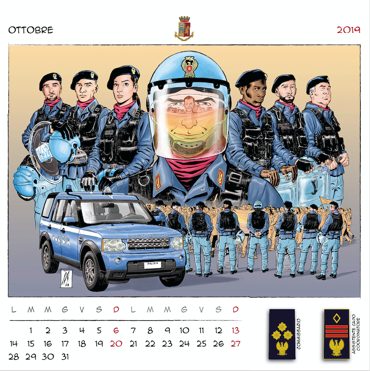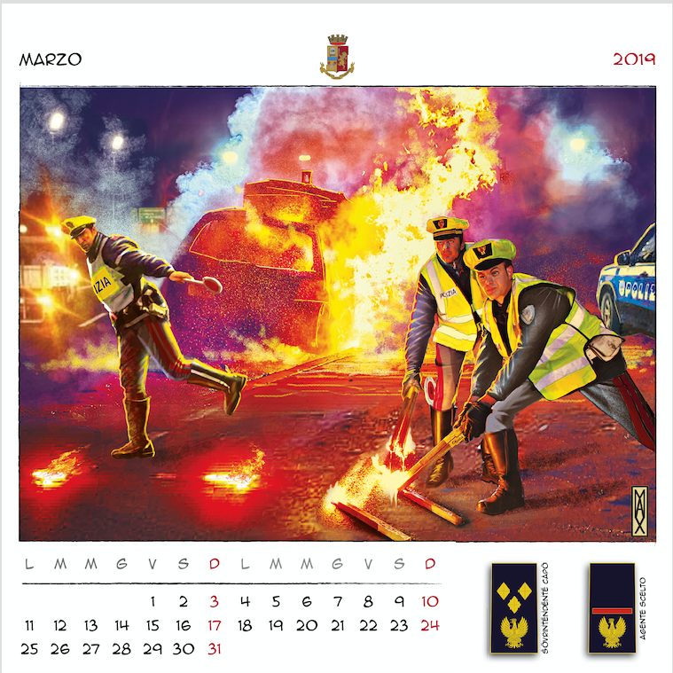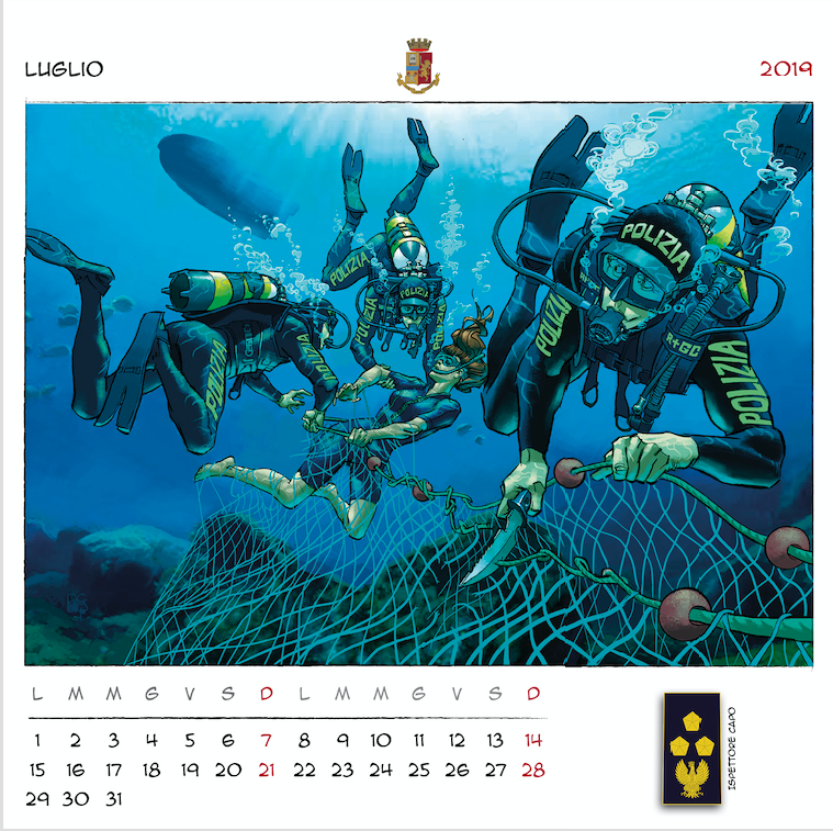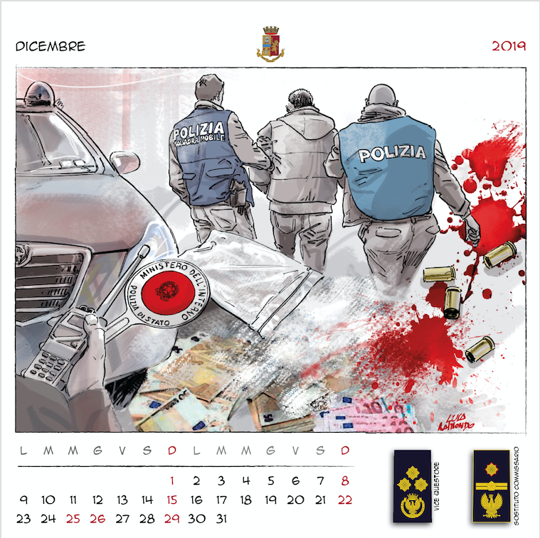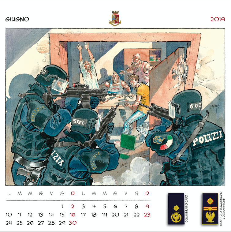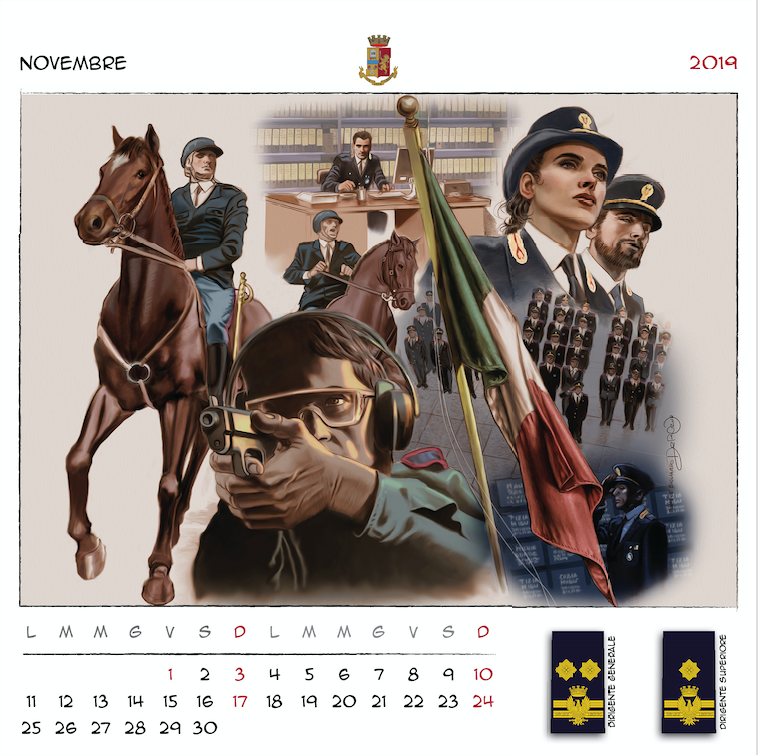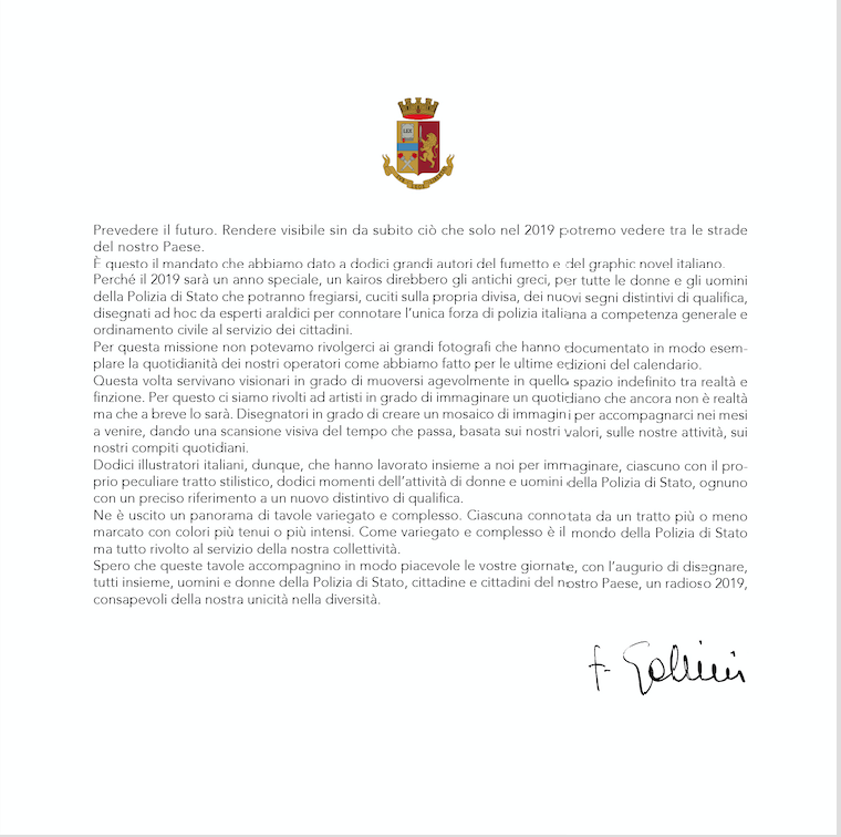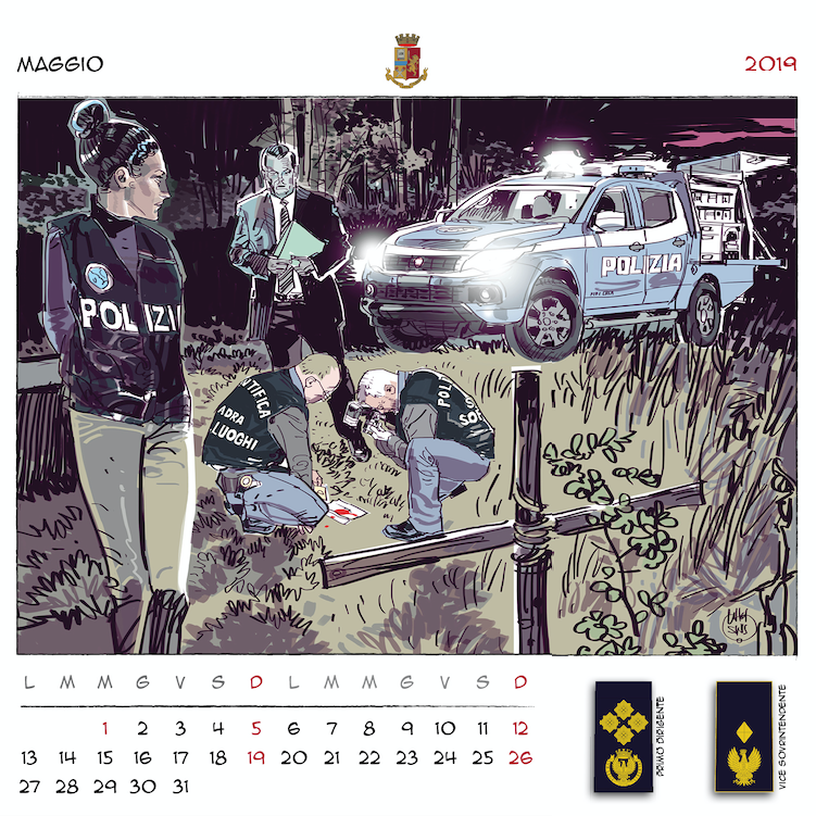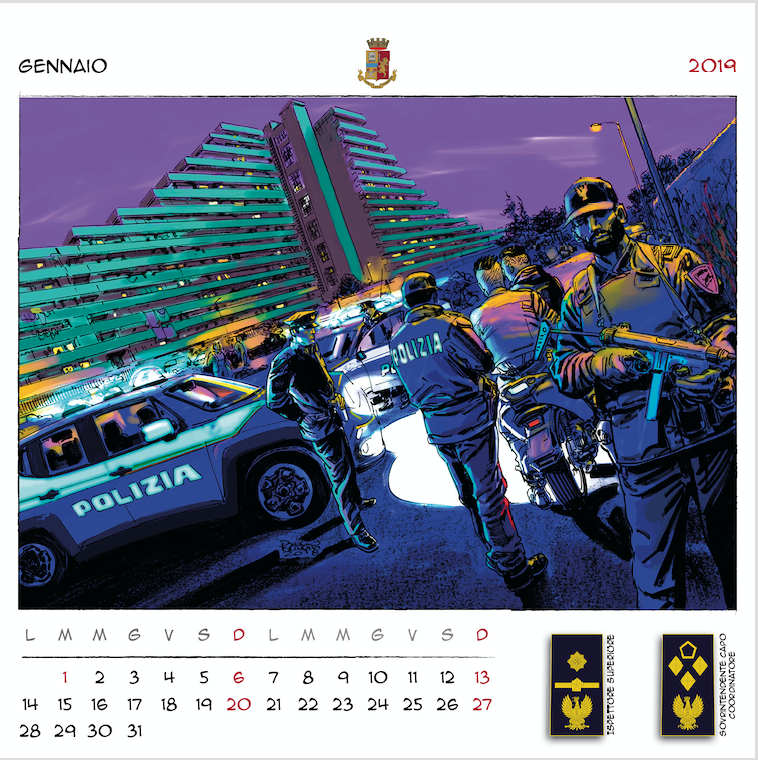 “Disegnatori in grado di creare un mosaico di immagini per accompagnarci nei mesi a venire, – ha concluso il prefetto Gabrielli – dando una scansione visiva del tempo che passa, basata sui nostri valori, sulle nostre attività, sui nostri compiti quotidiani. Dodici illustratori italiani, dunque, che hanno lavorato insieme a noi per immaginare, ciascuno con il proprio peculiare tratto stilistico, dodici momenti dell’attività di donne e uomini della Polizia di Stato, ognuno con un preciso riferimento a un nuovo distintivo di qualifica. Ne è uscito un panorama di tavole variegato e complesso. Ciascuna connotata da un tratto più o meno marcato con colori più tenui o più intensi. Come variegato e complesso è il mondo della Polizia di Stato ma tutto rivolto al servizio della nostra collettività“.