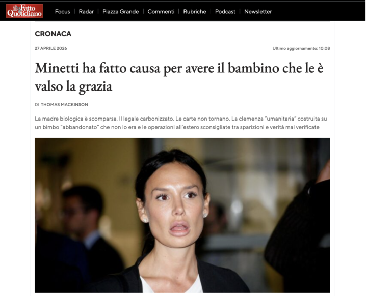 Il bambino grazie al quale Nicole Minetti ha ottenuto la grazia ha una madre biologica in Uruguay. lo rivela oggi in edicola il Fatto Quotidiano. Ma adesso la donna, María de los Ángeles González Colinet, è scomparsa: il 14 aprile, quattro giorni dopo il primo articolo del Fatto, le autorità hanno diramato un ordine di rintraccio a suo nome. Anche l’avvocata che difendeva quella madre non c’è più: è morta carbonizzata insieme al marito, anche lui avvocato, in circostanze sospette. Ufficialmente nulla collega questi accadimenti alla grazia della Presidenza della Repubblica che a febbraio ha cancellato le condanne definitive di Nicole Minetti a 3 anni e 11 mesi per “favoreggiamento della prostituzione” e “peculato” che la Minetti avrebbe dovuto scontare in affidamento in prova ai servizi sociali.