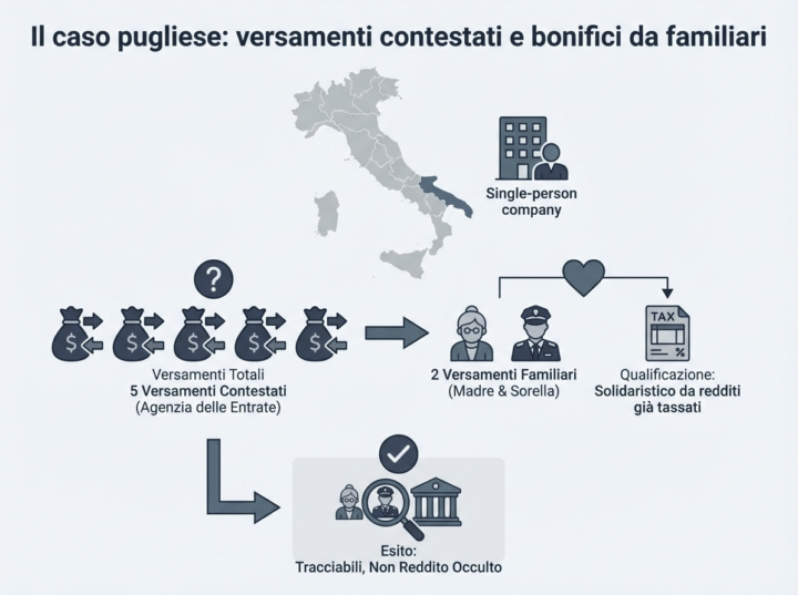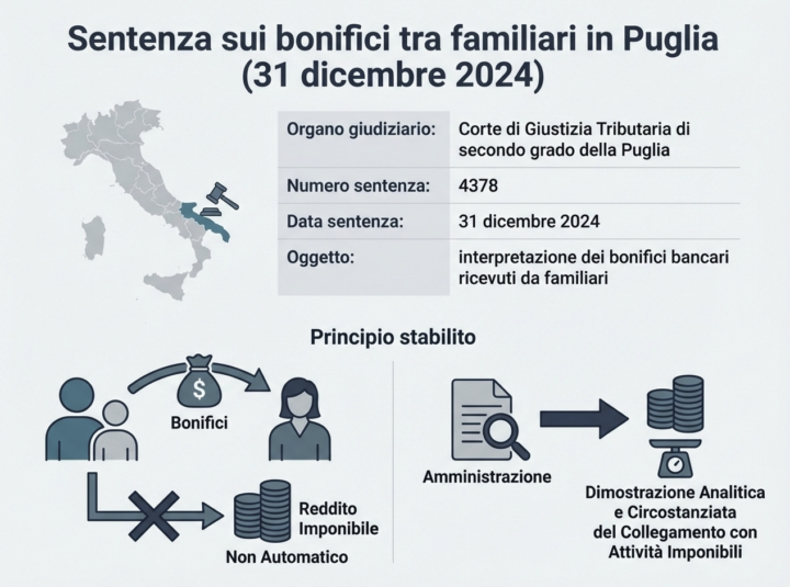 La Corte di Giustizia Tributaria di secondo grado della Puglia ha stabilito, con la propria sentenza n. 4378 del 31 dicembre 2024, che i bonifici ricevuti da familiari non assumono automaticamente rilevanza reddituale, a meno che l’Amministrazione non dimostri, in modo analitico e circostanziato, che si tratti di somme connesse ad attività imponibili. Secondo la Corte Tributaria, in sostanza, il supporto economico all’interno di una famiglia è da ritenersi fisiologico. Di conseguenza, un bonifico ricevuto da un parente stretto non può essere automaticamente ascritto come reddito occulto a condizione che l’ Agenzia delle Entrate riesca a risalire alla natura della somma.
