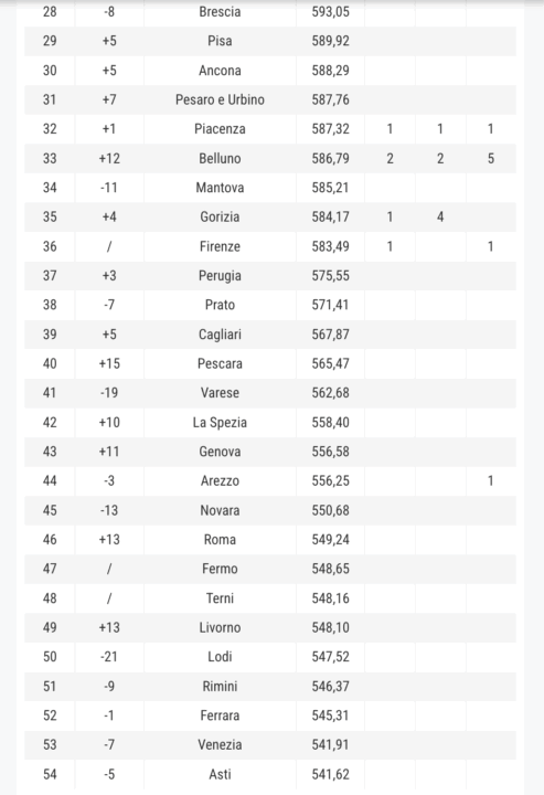 La top 10 è tutta settentrionale e premia, come spesso accade nella “bilancia” dei 90 indicatori, piccole province come Bergamo (vincitrice nel 2024, ora al 5° posto), Treviso, Padova (che ritorna tra le teste di serie dopo 30 anni di assenza: era nona nel 1994) e Parma. E segna il ritorno all’apice della classifica generale anche delle grandi aree metropolitane come Bologna e Milano, rispettivamente al 4° e all’8° posto, in testa per «Demografia, società e salute», la prima e per «Ricchezza e consumi» e «Affari e lavoro» la seconda.
