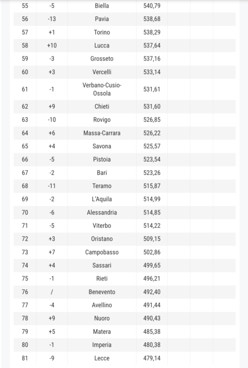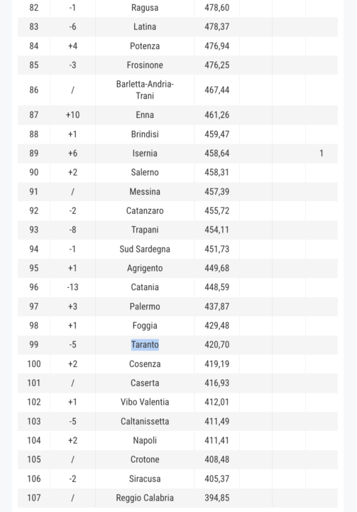 Se, come detto, il vertice della classifica è un buon mix tra piccole province e aree metropolitane del Nord, per individuare il primo territorio meridionale bisogna tornare al 39° posto di Cagliari. Il dato conferma una spaccatura geografica che, in 36 edizioni della Qualità della vita, non ha accennato a sanarsi, nonostante i punti di forza del Sud nella demografia, nel clima, nel costo della vita decisamente più accessibile, e i fondi (inclusi quelli del Pnrr) che negli anni hanno contribuito a dare una spinta alle imprese e al Pil dei territori in questione: le ultime 22 classificate, infatti, continuano a essere province meridionali.