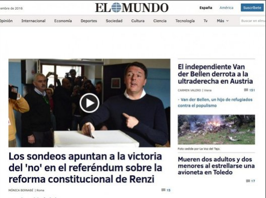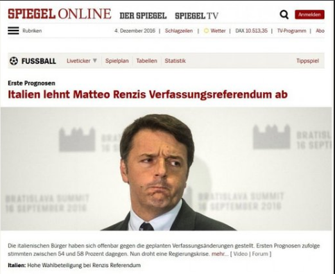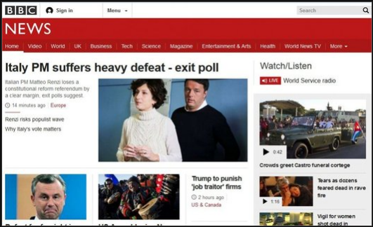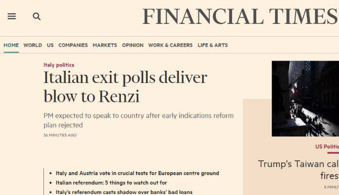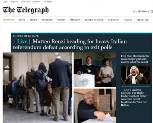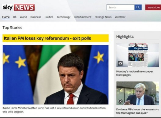 Le dimissioni di Renzi breaking news nel mondo. Le dimissioni annunciate dal premier Matteo Renzi dopo la sconfitta al referendum diventano immediatamente “breaking news” nel mondo. “Renzi si dimette dopo la dura sconfitta“, scrive l’inglese  Bbc. mentre il Guardian titola  “Il premier lascia“, il Washington Post dà la notizia delle dimissioni dopo la “sonora sconfitta al referendum“. Anche El Pais, The Telegraph  riportano in apertura la notizia delle dimissioni di Renzi .