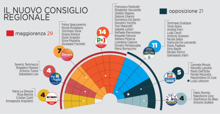 Confermati al Pd 3 seggi a Bari (Paolicelli, Vaccarella, Pagano) ed altrettanti nella Bat (Ciliento, De Santis, Vurchio), 2 a Brindisi (Matarrelli, Lettori), Foggia (Piemontese, Falcone), Lecce (Minerva, Capone) e Taranto (Pentassuglia, Borraccino). La lista civica di Decaro si aggiudica 2 seggi a Foggia (Starace, Scapato) ed 1 nelle altre province (Fischetti, Gioia, Miglietta, Rutigliano, Spaccavento, ). Al Movimento Cinque Stelle va solo 1 seggio a Bari (La Ghezza), Foggia (Barone), Lecce (Casili) e Taranto (Angolano). Alla lista “Per” vanno 1 seggio a Bari (Tammacco) , Bat (Passero), Foggia (Tutolo) e Lecce (Leo) .
