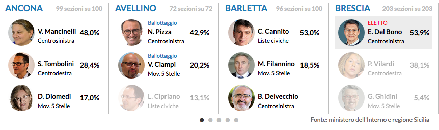 Il centrosinistra è avanti ad Ancona, unico capoluogo di regione dove si è votato per eleggere il sindaco e il Consiglio comunale. La sindaca Pd uscente Valeria Mancinelli è in vantaggio, con oltre il 40%, sugli altri competitors e se la vedrà al ballottaggio con il candidato civico sostenuto dal centrodestra Stefano Tombolini. Con Emilio Del Bono il centrosinistra conquista Brescia senza dover andare al ballottaggio mentre il Movimento Cinque Stelle perde molti consensi e si ferma sotto il 6%. Ballottaggio a due a fine giugno ad Avellino dove il candidato del centrosinistra Nello Pizza dovrà affrontare Vincenzo Ciampi del M5S.