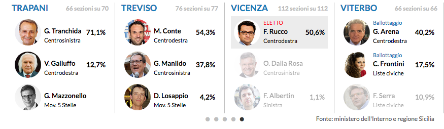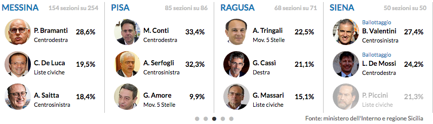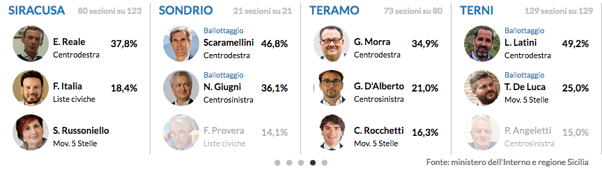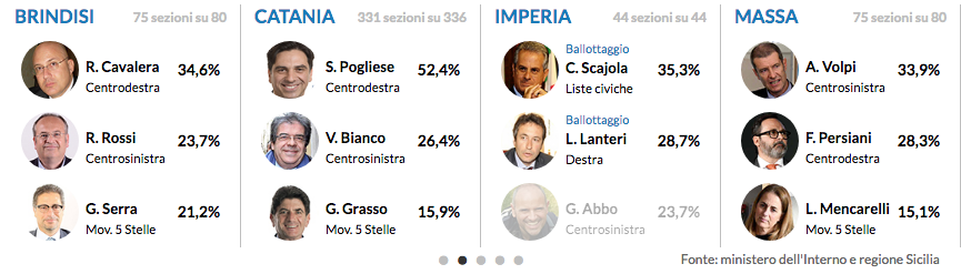 L’ex ministro di Forza Italia Claudio Scajola, che si è presentato con una coalizione di liste civiche di centrodestra, è attualmente primo nelle preferenze degli elettori di Imperia e sfiderà al ballottaggio Luca Lanteri, sostenuto da Lega e Fratelli d’Italia. Centrodestra in netto vantaggio anche a Teramo dove il candidato Giandonato Morra può vantare oltre il 36% delle preferenze, con un distacco di 15 punti su Gianguido D’Alberto, candidato del Pd. Marco Scaramellini, candidato di centrodestra alla poltrona di primo cittadino a Sondrio, ha preso più del 40% e si batterà a fine mese con Nicola Giugni del centrosinistra. A Brindisi stessa dinamica: il candidato di centrodestra Roberto Cavalera, con più del 33% delle preferenze, si scontrerà con Riccardo Rossi candidato del Pd per la poltrona di primo cittadino .