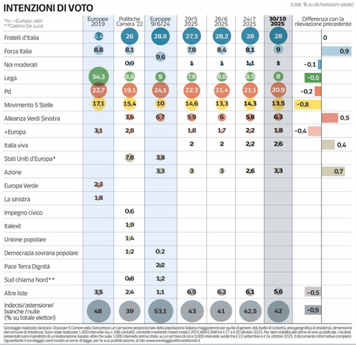 Sembra quindi che l’alzarsi dei toni, il crescere del conflitto, la mobilitazione anche vasta dei cittadini non incidano o quasi sull’elettorato. Nell’opposizione non c’è (e lo si era visto chiaramente già nel voto delle Marche) un effetto Gaza, nonostante un imponente e partecipato sciopero, né un effetto Ranucci, il giornalista di “Report” che è stato oggetto di un attentato, a seguito del quale si è parlato di un rischio democratico per il nostro Paese. Per le forze di maggioranza non c’è un effetto Trump, dopo la tregua nel Medio Oriente, né un effetto Kirk, l’attivista politico statunitense assassinato il 10 settembre, che ha portato il centrodestra e la premier Meloni ad accusare la sinistra di fomentare un clima di odio.