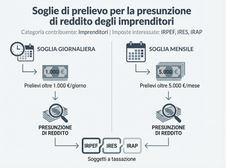 La presunzione non viene applicata in modo uniforme alle diverse imposte. La distinzione tra versamenti e prelievi incide sul perimetro del controllo e sul tipo di difesa possibile. Per le imposte sui redditi (IrpefIres e Irap) la disciplina cambia a seconda della categoria del contribuente. Per gli imprenditori, la presunzione riguarda sia le entrate sia le uscite, purché i prelievi superino 1.000 euro giornalieri o 5.000 euro mensili.