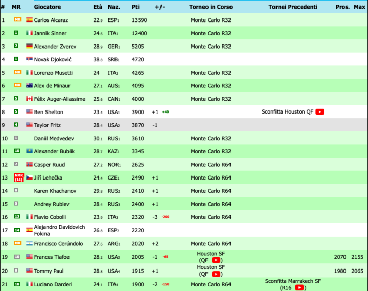 La classifica Atp aggiornata in tempo reale dice che lo spagnolo Alcaraz è sempre numero uno con 13.590 punti, Sinner secondo con 12.400. Dunque, “ballano” 1.190 punti che da domenica 5 aprile, giorno di inizio del torneo, diventeranno soltanto 190 punti di distacco tra primo e secondo perché a ogni inizio torneo vengono tolti i punti conquistati l’anno precedente. È proprio lo spagnolo chiamato a difendere la vittoria dello scorso anno in finale contro Lorenzo Musetti (mille punti) mentre Sinner non ha partecipato per il noto caso Clostebol (dunque, nessun punto da difendere).