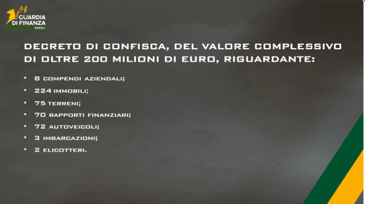 La Sezione Misure di Prevenzione del Tribunale di Napoli (presidente Teresa Areniello) ha disposto una confisca da 205 milioni di euro nei confronti dei fratelli Giovanni, Cuono e Salvatore Pellini, imprenditori operanti nel settore del recupero, smaltimento e riciclaggio di rifiuti urbani e industriali. Il Gico del Nucleo PEF della Guardia di Finanza di Napoli ha apposto i sigilli a 8 aziende tra Napoli, Frosinone e Roma, 224 immobili tra Napoli, Salerno, Caserta, Cosenza, Latina e Frosinone; 75 terreni; 70 rapporti finanziari (conti correnti, investimenti ecc) , 72 auto, 3 barche e 2 elicotteri.