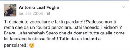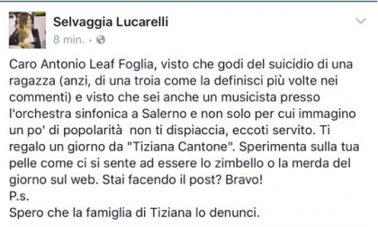 Ma vi è stato accanimento senza fine nei confronti di Tiziana Cantone, la povera ragazza morta suicida a causa dello scandalo che l’ha vista, suo malgrado, protagonista. Qualcuno ha scritto incredibilmente “Spero che da domani, tutte quelle come lei facciano la stessa fine“. Ma ad indignare questa volta sono state le parole scritte di un salernitano, tale Antonio Foglia, che sulla propria bacheca Facebook ha rivolto parole pesantissime nei confronti della ragazza: “Ti è piaciuto zoccoliare e farti guardare!?!?adesso non ti resta che da un foulard penzolare…stai facendo il video!?!?Brava – ha scritto nel suo post pubblico, proseguendo poi in un macabro auspicio – Spero che da domani tutte quelle come lei facciano la stessa fine!!! Tutte da un foulard a penzolare!!!”.