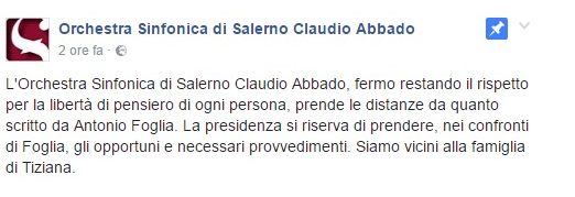 Poco dopo, avvedutosi dell’errore, Foglia ha rimosso il post incriminato. La Lucarelli, però, è tornata ad apostrofarlo con un altro duro post. Antonio Foglia, che vive a Giffoni Valle Piana, in provincia di Salerno, è fra l’altro trombone presso l’orchestra sinfonica di Salerno “Claudio Abbado” ma questa ha immediatamente preso le distanze dalle parole del giovane.