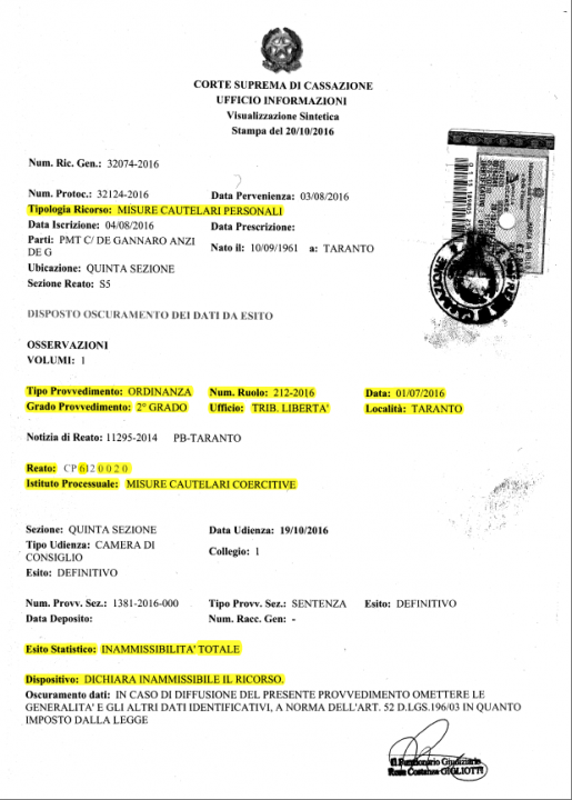 La Suprema Corte di Casszione ritiene “totalmente inammissibile” il ricorso della Procura della repubblica contro il Tribunale del Riesame di Taranto, che ha annullato la misura interdittiva e le accuse di stalking “confezionate” nei confronti del nostro direttore Antonello de Gennaro.nei confronti del quale era stato prsino richiesto l’arresto nel luglio 2014 per aver pubblicato su Facebook la notizia di essere stato asolto con formula piena in un processo mediatico a Roma. Notizia e dichiarazioni del de Gennaro pubblicate dal Corriere della Sera, il Messaggero, l’ Ansa, il settimanale CHI