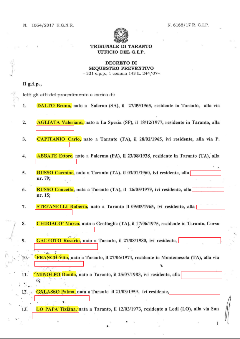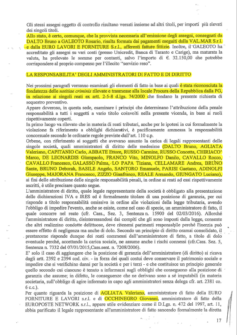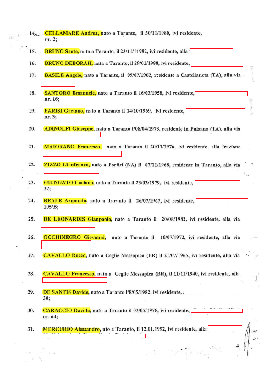 Tra gli indagati compaiono noti frequentatori delle aule di giustizia, come Gaetano Abbate il titolare della ditta Kent, già arrestato per altri episodi di corruzione nella fornitura di servizi e prodotti alla pubblica amministrazione , che fornisce abbigliamento persino alle forze dell’ ordine, fornitore “privilegiato della Polizia Municipale del Comune di Taranto, la cui moglie è stata assunta ed è già in servizio presso la Polizia Municipale di Statte il cui concorso pè oggetto di indagine da parte della Procura di Taranto. O come Valeriano Agliata, un ex-consigliere comunale di Forza Italia, che cercava di nascondersi nelle sue società utilizzando (inutilmente) una società fiduciaria del Monte dei Paschi di Siena, arrestato anch’egli in occasione dello scandalo delle tangenti a Maricommi Taranto della Marina Militare.
