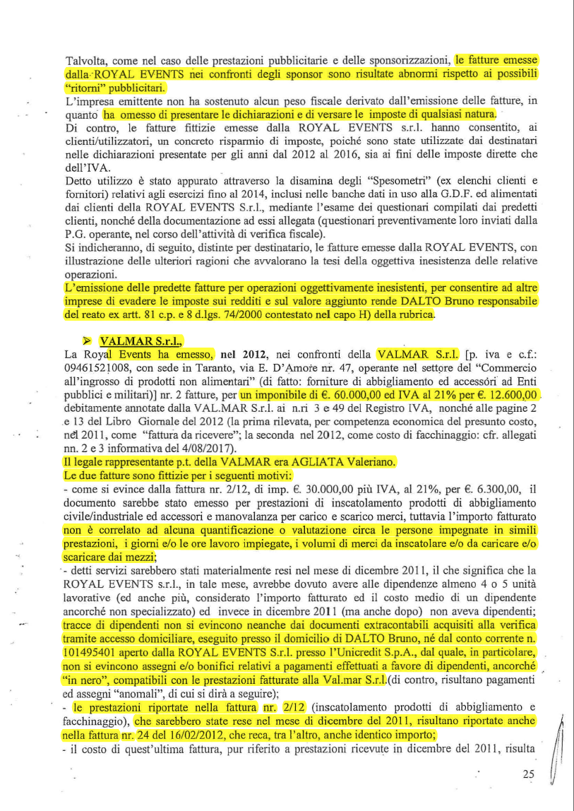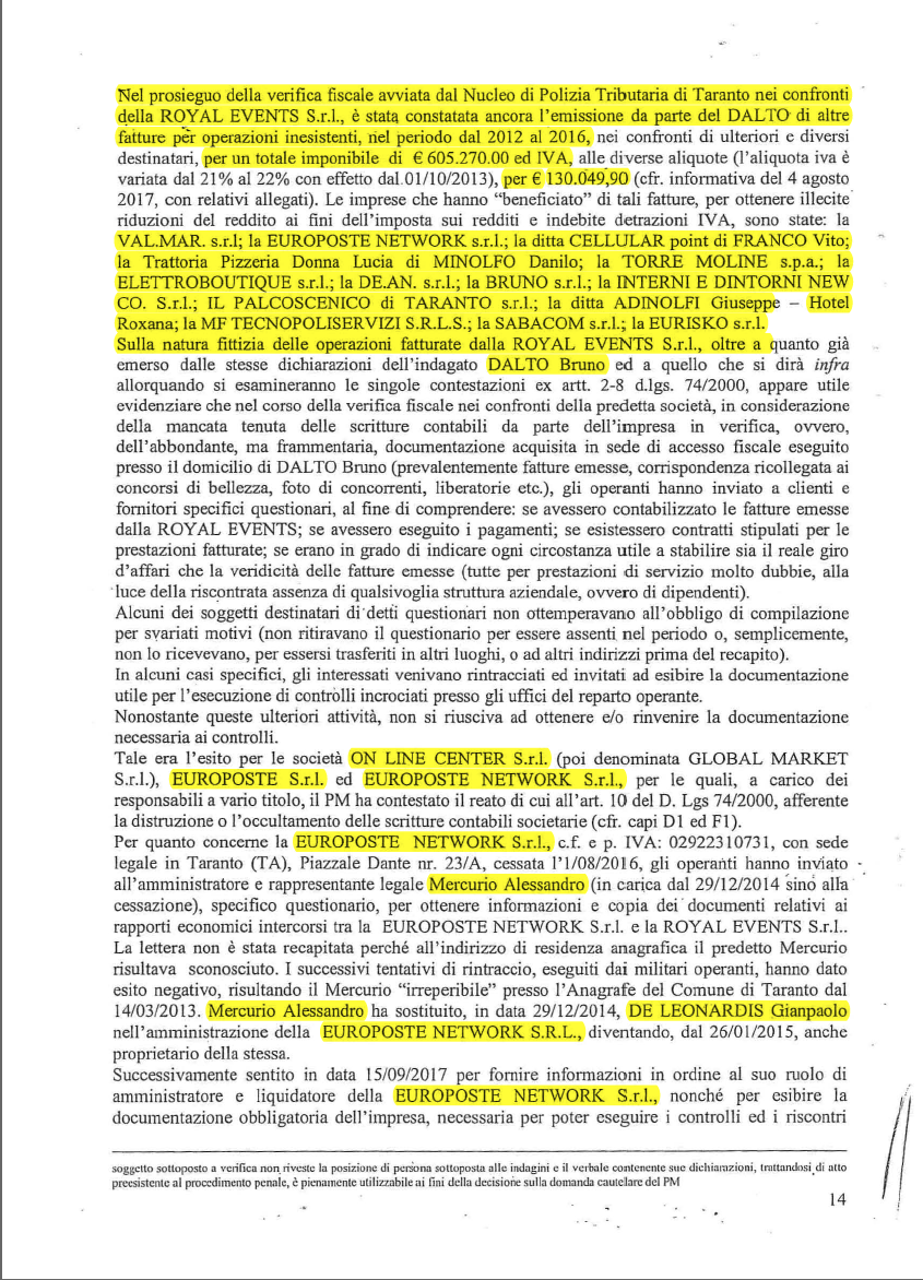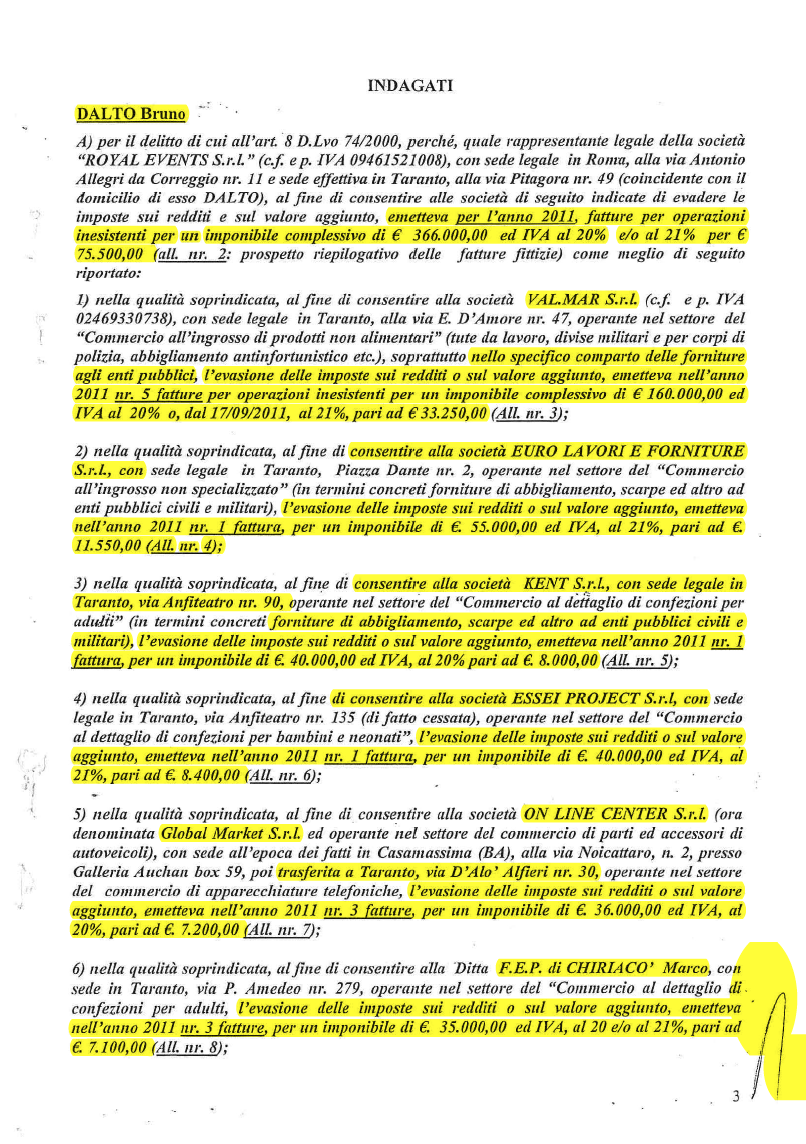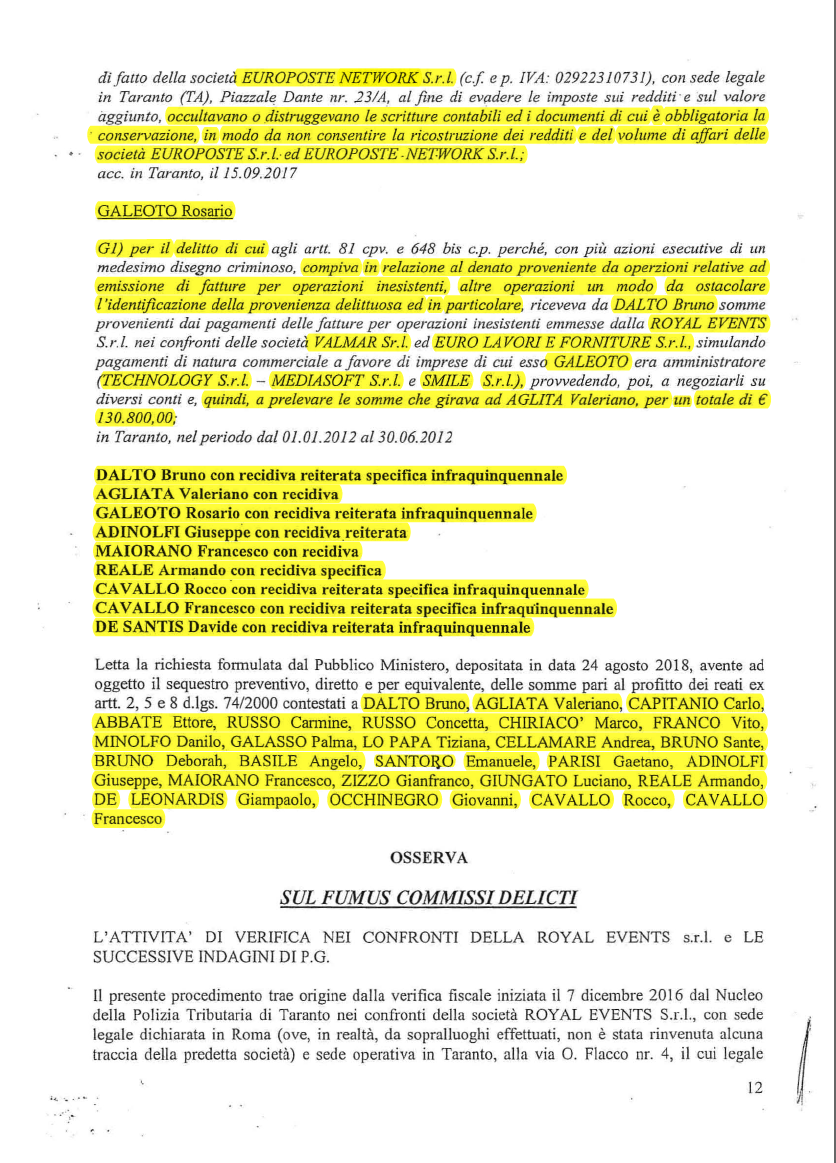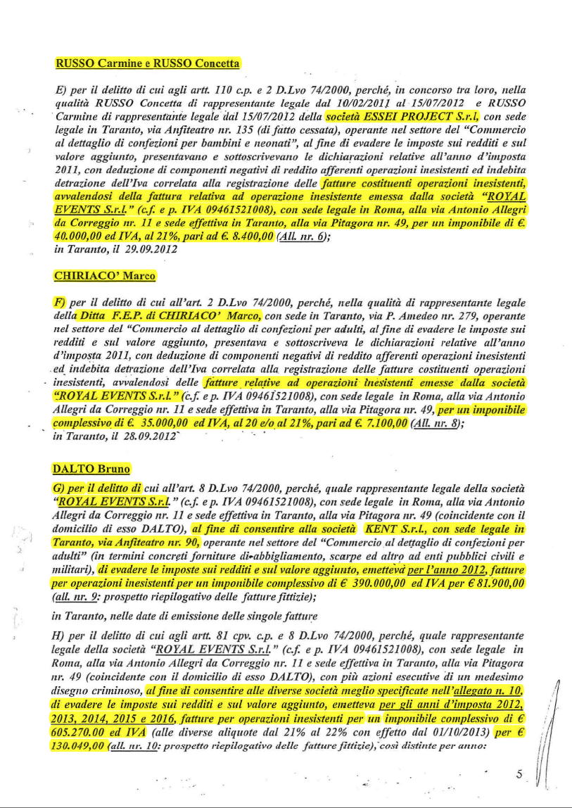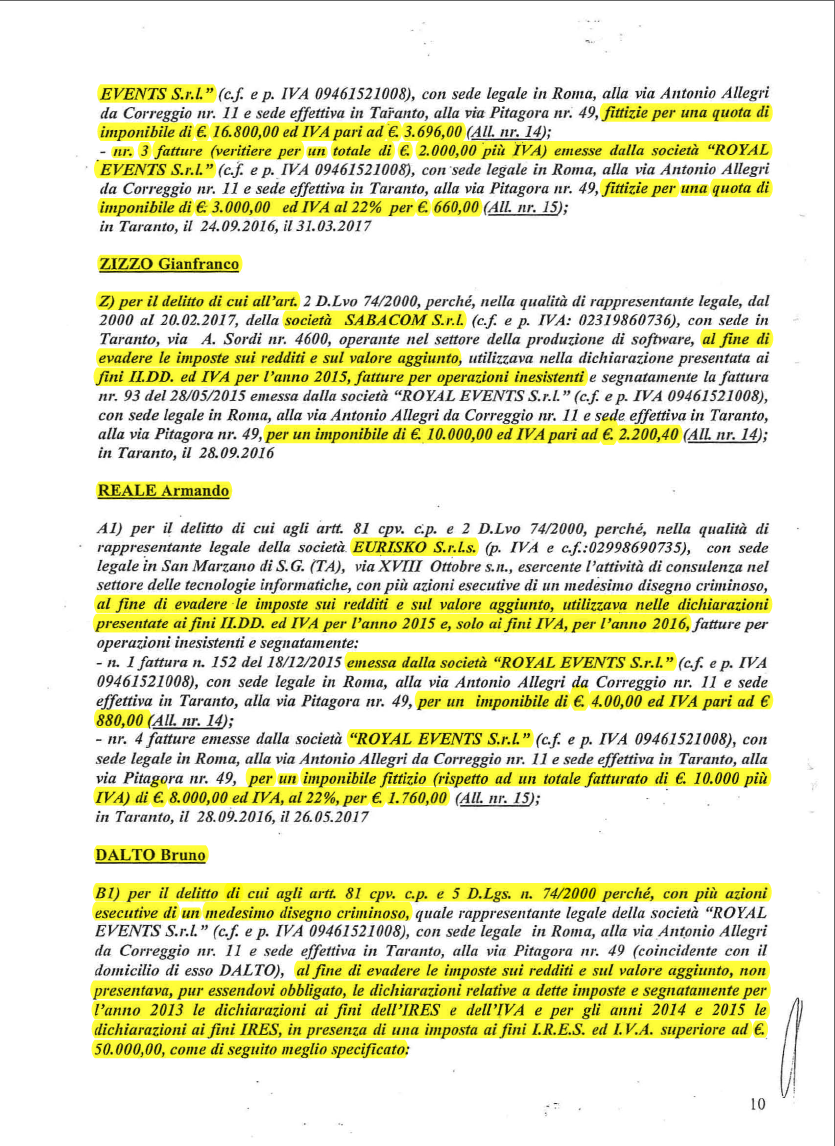 L’ inchiesta della Finanza ha portato al sequestro richiesto del pm Enrico Bruschi, che è stato convalidato dal Gip del Tribunale di Taranto dr. Benedetto Ruberto di conti correnti e beni per circa 700mila euro nei confronti di Bruno Dalto e di una trentina di altri indagati (fra i quali nomi ben noti alle cronache giudiziarie tarantine) di cui il CORRIERE DEL GIORNO è in grado come sempre ed in esclusiva di rivelare nomi e cognomi. Nelle pagine del decreto di sequestro, il giudice per le indagini preliminari evidenzia che tutto è partito dalla verifica fiscale a carico della società “Royal Events” di Bruno Dalto, la quale negli anni tra il 2011 e il 2014 presentava delle dichiarazioni fiscali particolarmente sospette, pur in presenza di numerose fatture ingiustificate . Il Gip Ruberto ha evidenziato peraltro che mentre “per gli anni 2011 e 2012, erano state presentate dichiarazioni con volumi d’affari pari a zero, mentre per gli anni successivi le dichiarazioni erano state completamente omesse“.