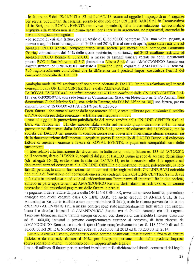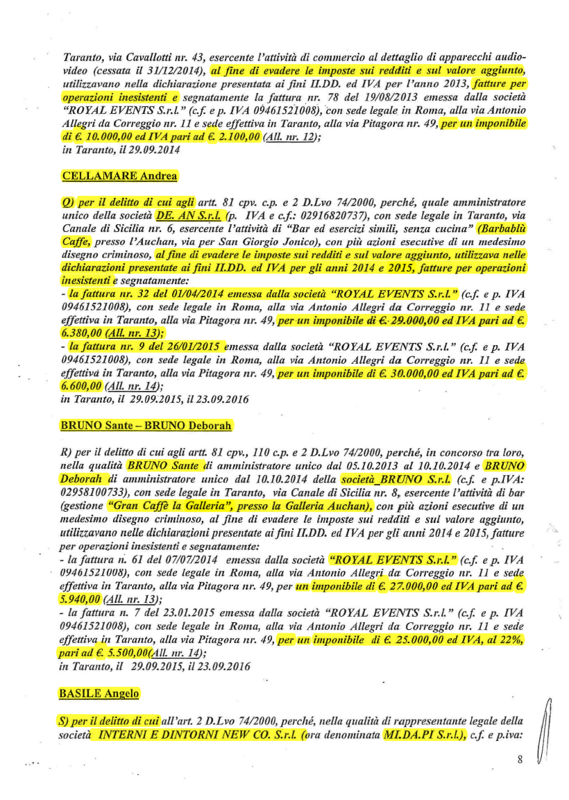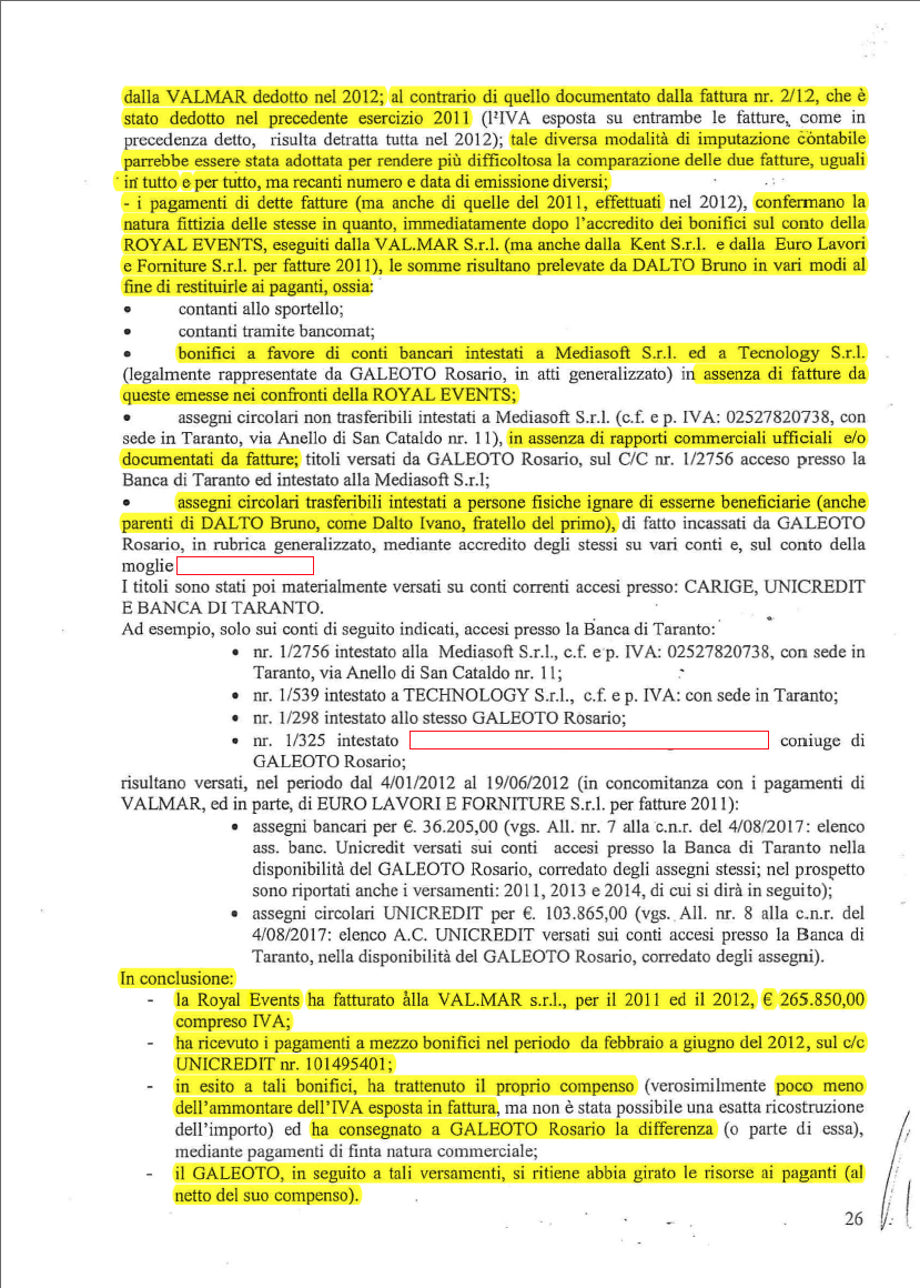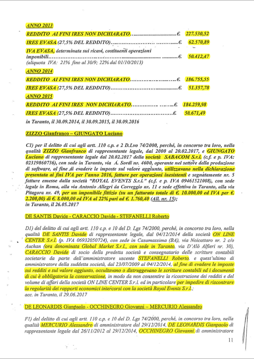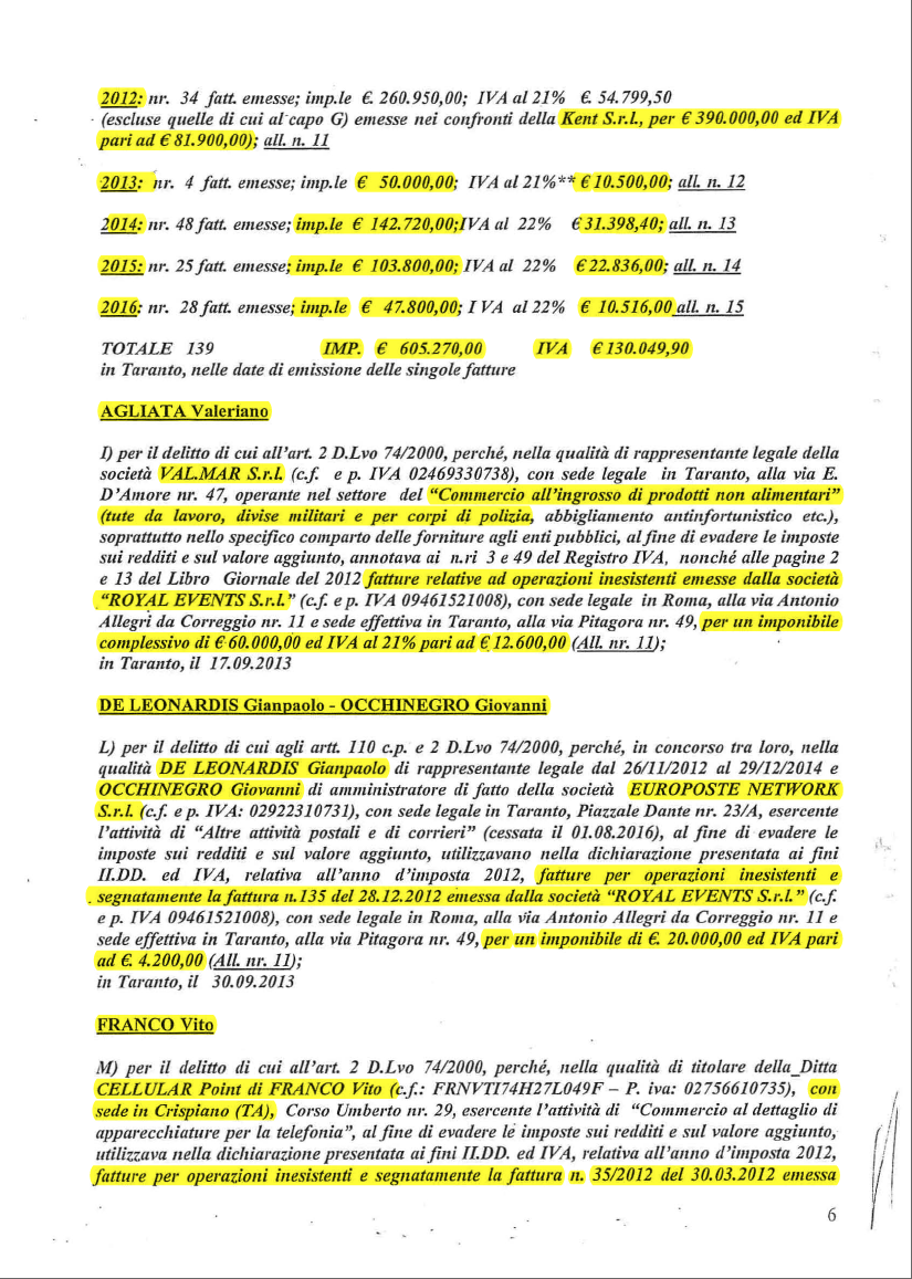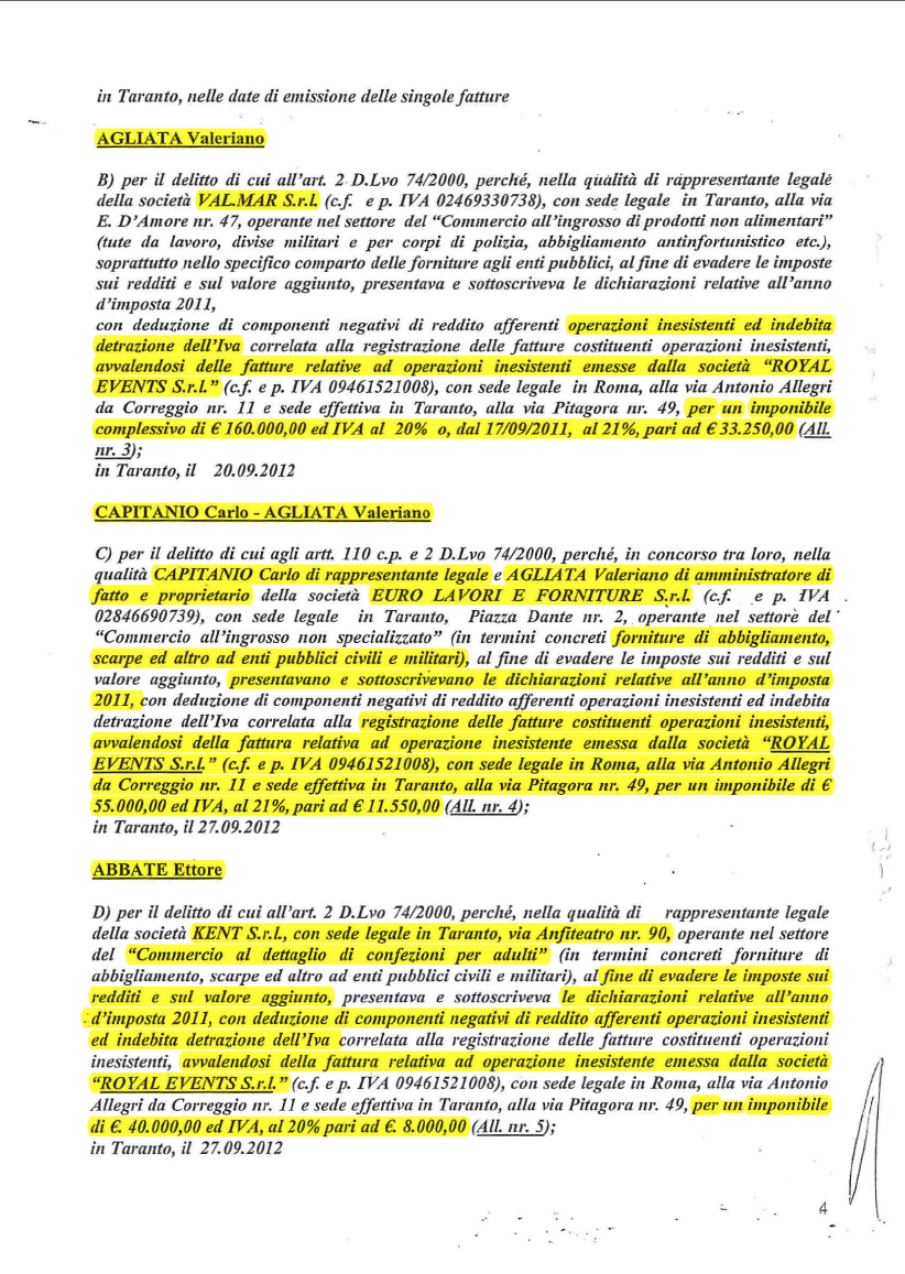 L’ inchiesta della Finanza ha portato al sequestro richiesto del pm Enrico Bruschi, che è stato convalidato dal Gip del Tribunale di Taranto dr. Benedetto Ruberto di conti correnti e beni per circa 700mila euro nei confronti di Bruno Dalto e di una trentina di altri indagati (fra i quali nomi ben noti alle cronache giudiziarie tarantine) di cui il CORRIERE DEL GIORNO è in grado come sempre ed in esclusiva di rivelare nomi e cognomi. Nelle pagine del decreto di sequestro, il giudice per le indagini preliminari evidenzia che tutto è partito dalla verifica fiscale a carico della società “Royal Events” di Bruno Dalto, la quale negli anni tra il 2011 e il 2014 presentava delle dichiarazioni fiscali particolarmente sospette, pur in presenza di numerose fatture ingiustificate . Il Gip Ruberto ha evidenziato peraltro che mentre “per gli anni 2011 e 2012, erano state presentate dichiarazioni con volumi d’affari pari a zero, mentre per gli anni successivi le dichiarazioni erano state completamente omesse“.