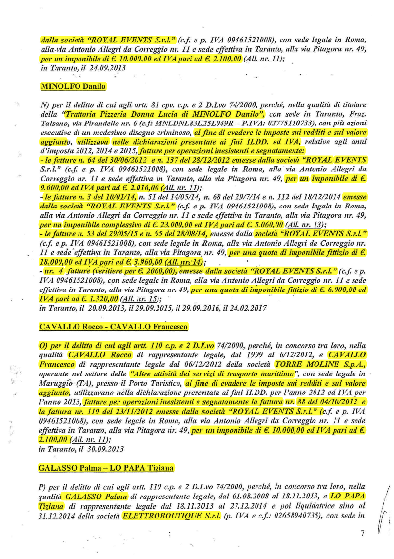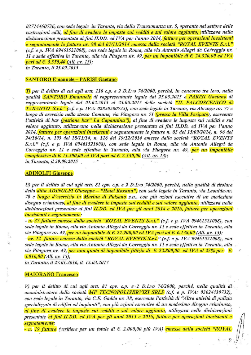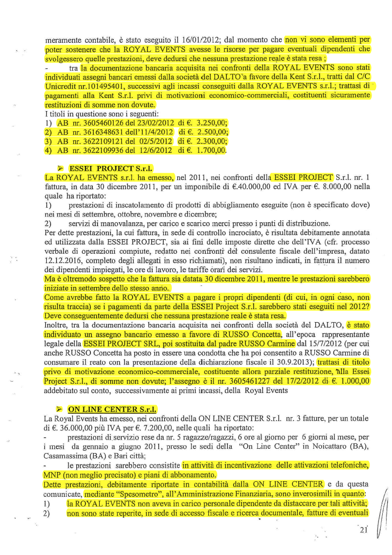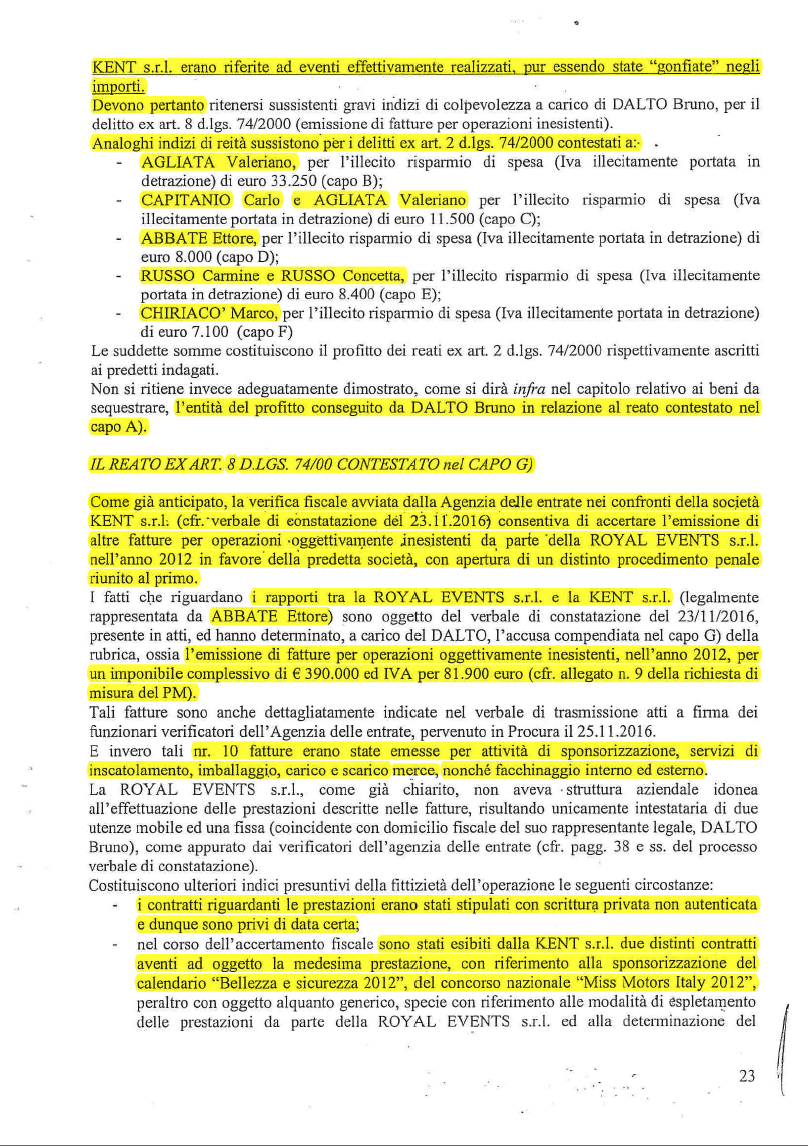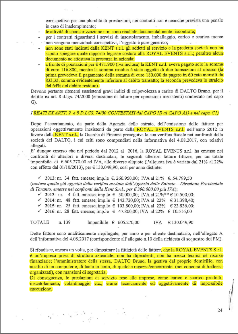 Nel decreto di sequestro preventivo, scrive il Gip Ruberto “non sono stati trovati documenti probanti lo svolgimento, da parte della Royal Events, di attività diverse da quelle innanzi descritte, né relativi all’assunzione e gestione di dipendenti o collaboratori” evidenziando la circostanza che società era di fatto “priva di una vera e propria struttura aziendale”, rendendo nei confronti di diverse società, prestazioni di servizi di vario genere, quasi sempre per importi esondanti rispetto alle reali operatività della società.