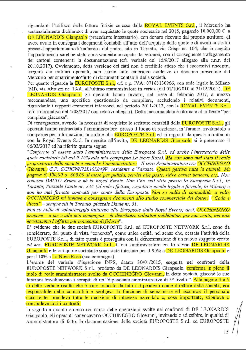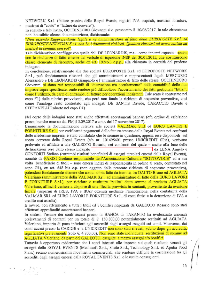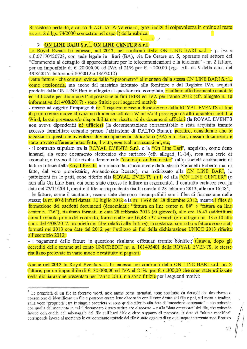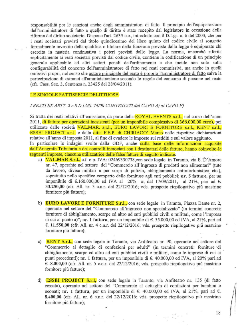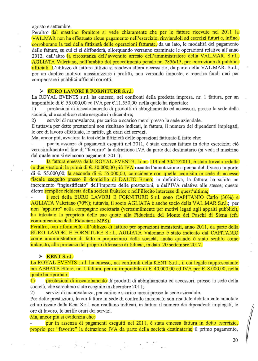 Nel decreto di sequestro preventivo, scrive il Gip Ruberto “non sono stati trovati documenti probanti lo svolgimento, da parte della Royal Events, di attività diverse da quelle innanzi descritte, né relativi all’assunzione e gestione di dipendenti o collaboratori” evidenziando la circostanza che società era di fatto “priva di una vera e propria struttura aziendale”, rendendo nei confronti di diverse società, prestazioni di servizi di vario genere, quasi sempre per importi esondanti rispetto alle reali operatività della società.