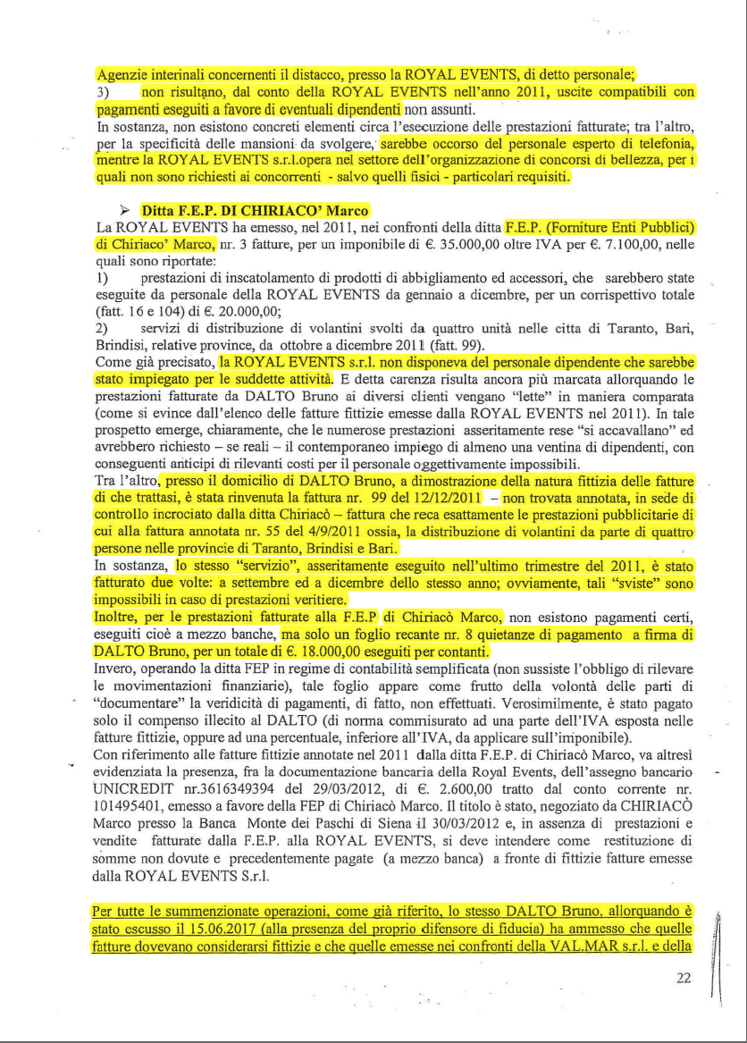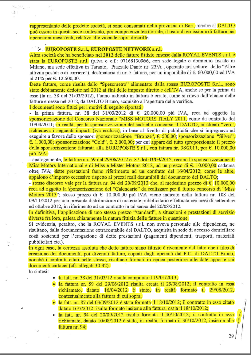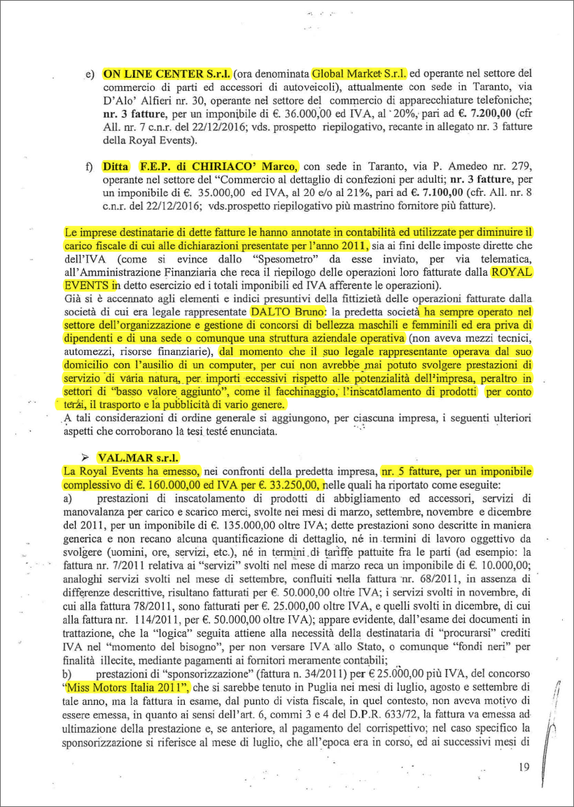 Servizi offerti in settori indicati per il loro “basso valore aggiunto”. In poche parole la Royal Events, occupandosi in realtà esclusivamente dell’organizzazione di concorsi di bellezza, e fatturava prestazioni assolutamente estranee al proprio oggetto sociale, quale facchinaggio, inscatolamento di prodotti, trasporto e pubblicità di vario genere. La Guardia di Finanza ha interrogato nel 2017 il Dalto che in prima battuta ha cercato di fornire una versione dei fatti poco credibile per giustificare il proprio operato, e successivamente di fronte alle contestazioni inconfutabili degli investigatori e del pm Bruschi ha preferito alleggerire la propria posizione giudiziaria ammettendo e confessando che in realtà si trattava di operazioni inesistenti o di eventi realmente realizzati, ma per i quali erano stati segnati contributi gonfiati.