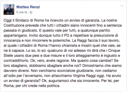 “La Raggi faccia il suo lavoro – continua Renzi – al quale i cittadini di Roma l’hanno chiamata e mostri quel che vale, se ne è capace. Lo so, lo so: qualcuno di voi adesso mi dirà che i Cinque Stelle usano due pesi e due misure e il loro atteggiamento è ingiusto e contraddittorio. Ok, vero, avete ragione. Ma questo cosa cambia? Se loro sbagliano, dobbiamo sbagliare anche noi? Dimostriamo che siamo davvero diversi”, sottolinea il segretario del Pd. “Non cerchiamo scorciatoie giudiziarie, non cediamo all’odio per l’avversario, non attacchiamo Virginia Raggi oggi. Ha avuto un avviso di garanzia? Ok, auguriamoci che sia innocente. Per lei, per Roma, per chi crede nella politica”, conclude Renzi.