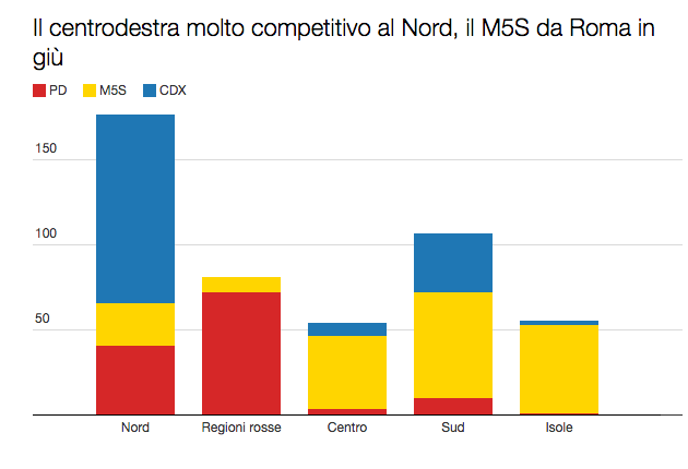 A livello di distribuzione territoriale del voto, il partito di Grillo riuscirebbe ad essere estremamente competitivo nel Centro e nelle Isole, dove eleggerebbe rispettivamente 43 e 52 deputati nei collegi uninominali, sui 54 e 55 in palio in queste due zone. Maanche nel Sud si farebbe sentire la forza elettorale dei 5 stelle (62 seggi su 106), che qui incontrerebbero la più agguerrita concorrenza del centrodestra, che si assesterebbe a 34 deputati. In particolare, sulla base del voto 2014, la Campania e la Puglia vedono buone chance per il polo conservatore. Se d’altra parte le Regioni Rosse restano appannaggio del PD (72 deputati su 80), al Nord la sfida è più aperta, ma sarebbe sempre il centrodestra ad imporsi sul partito di Renzi (e Gentiloni), portando a casa 110 deputati contro i 41 dei democratici.