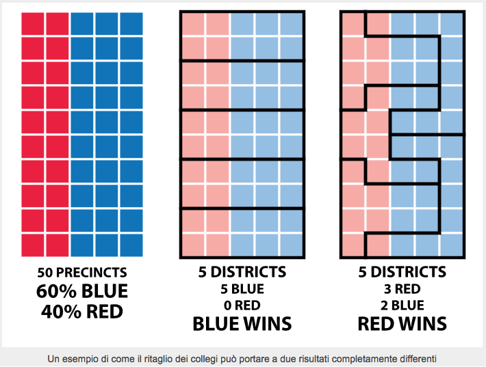 In seconda battuta, i collegi utilizzati per la simulazione sono quelli definiti con decreto legislativo nel 1993. Ad oggi andrebbero rivisti dal Governo in carica, su indicazione delle Camere. Questa operazione è rilevante su due fronti. Da una parte vi sono stati negli ultimi vent’anni alcune variazioni nella distribuzione della popolazione in Italia: il peso demografico di Lombardia (dove il centrodestra consegue più collegi), Lazio (M5S), Veneto (CDX) ed Emilia-Romagna (PD) è aumentato; mentre è diminuito quello di Calabria (M5S-CDX), Sicilia (M5s), Liguria (M5S-PD), Puglia (M5S-CDX), Piemonte (M5S-CDX) e Campania (M5S-CDX). In sostanza, ridisegnando i collegi nel 2016 le regioni che saranno penalizzate sono quelle dove il Movimento 5 Stelle ed il centrodestra raccolgono maggiori consensi, e questo potrebbe rappresentare un lieve vantaggio competitivo del PD. A questo si aggiunga il secondo versante, per il quale sarà il Governo a ridefinire i confini dei collegi, e non è da escludersi qualche operazione di gerrymandering (termine con il quale si indica l’operazione che vede i collegi ritagliati per favorire il controllo da parte di un determinato partito). Ovviamente anche questo effetto non sarebbe determinante, ma nel caso può solo andare a favore delle forze di maggioranza.
